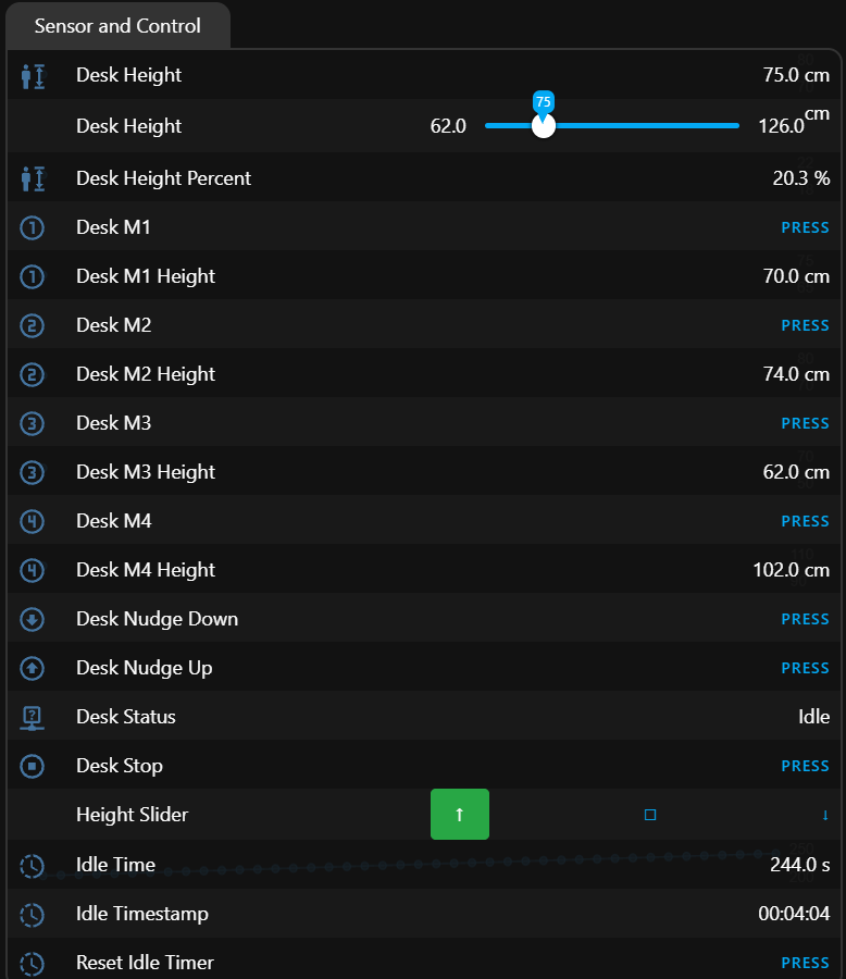 32 entities are exposed in Home Assistant that let you control every function of the DeskUp pro.